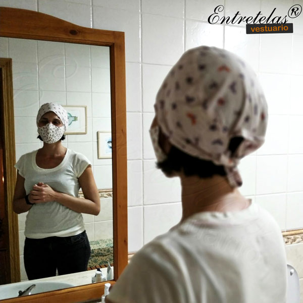 Se adapta a diversos tamaños, con una cinta para atar. Si desea botones para sujetar la mascarilla por fuera del gorro sanitario, indíquelo en los comentarios (sin coste añadido)