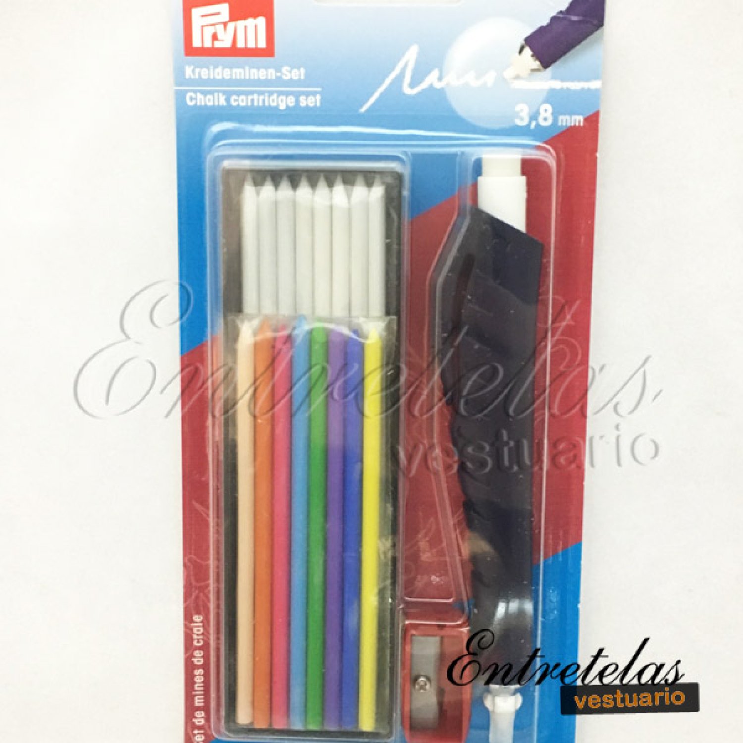Portaminas de Prym 3,8 mm. Lápiz de costrura Prym. Incluye 9 minas blancas, 8 colores variados, un afilador