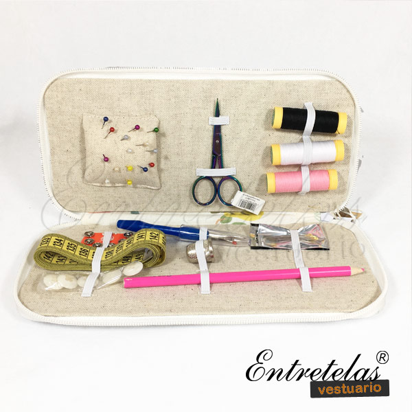 Incluye: tijera, cinta métrica, lápiz de marcar, descosedor, agujas de coser, dedal, alfileres, automáticos, selección de hilos y botones de repuesto