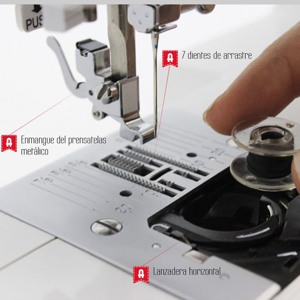 · 7 filas de dientes de arrastre para un transporte de tejido más eficaz.