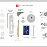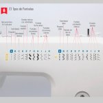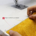 · Placa de aguja con guías en milímetros y pulgadas a ambos lados de la aguja.