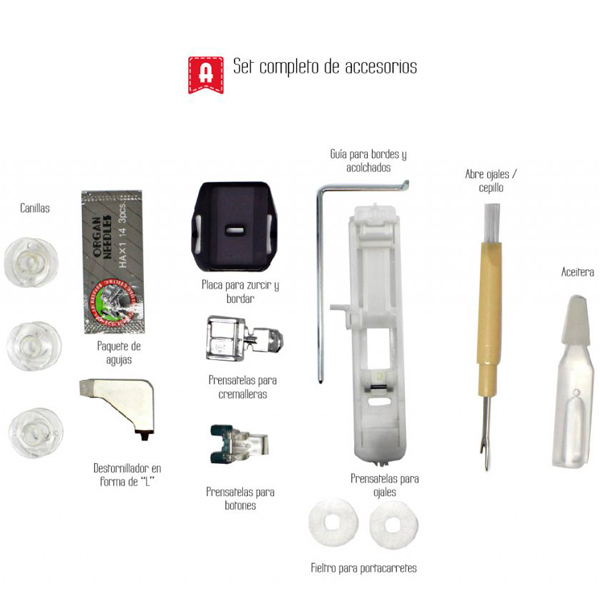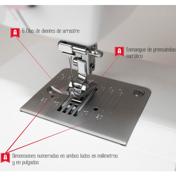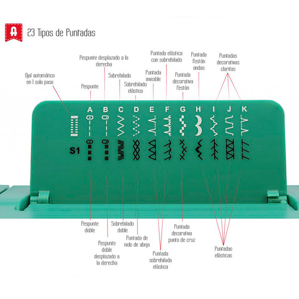 · 23 puntadas para todo tipo de labores: Ojal automático en 1 paso, Básicas, Decorativas, Festones, Superautomáticas, Zig-zag.