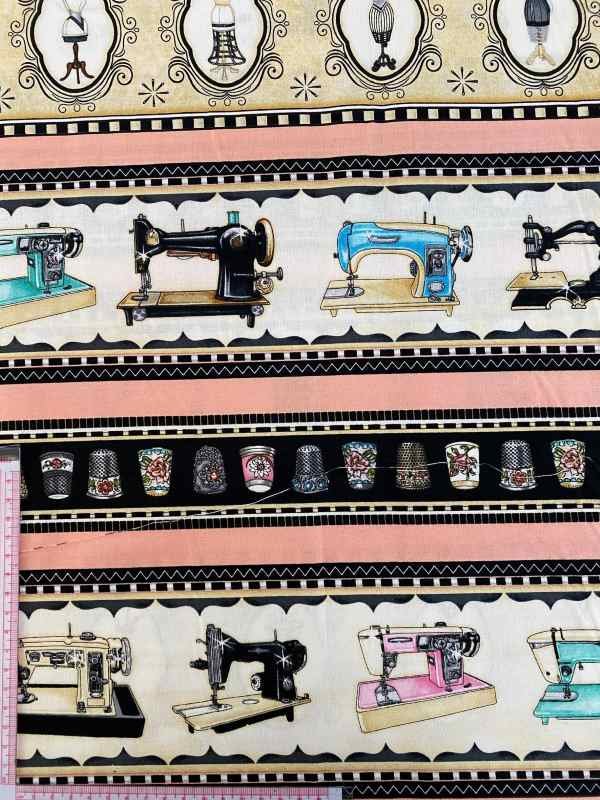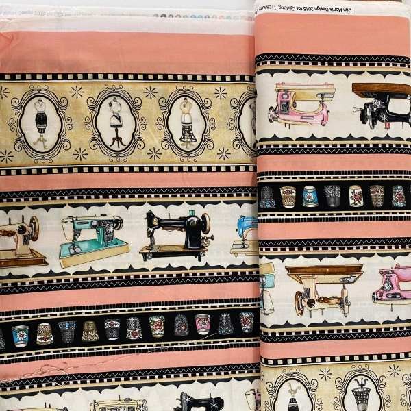 Dibujos estampados en cenefas con elementos de costuras: maniquies, máquinas de coser, dedales. La estampación va a lo largo del tejido, no a lo ancho.