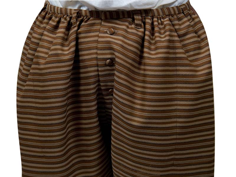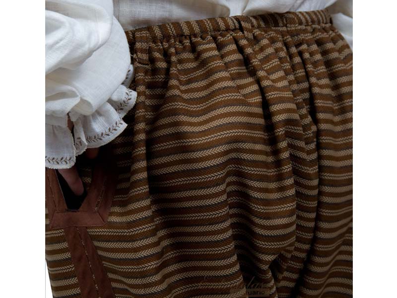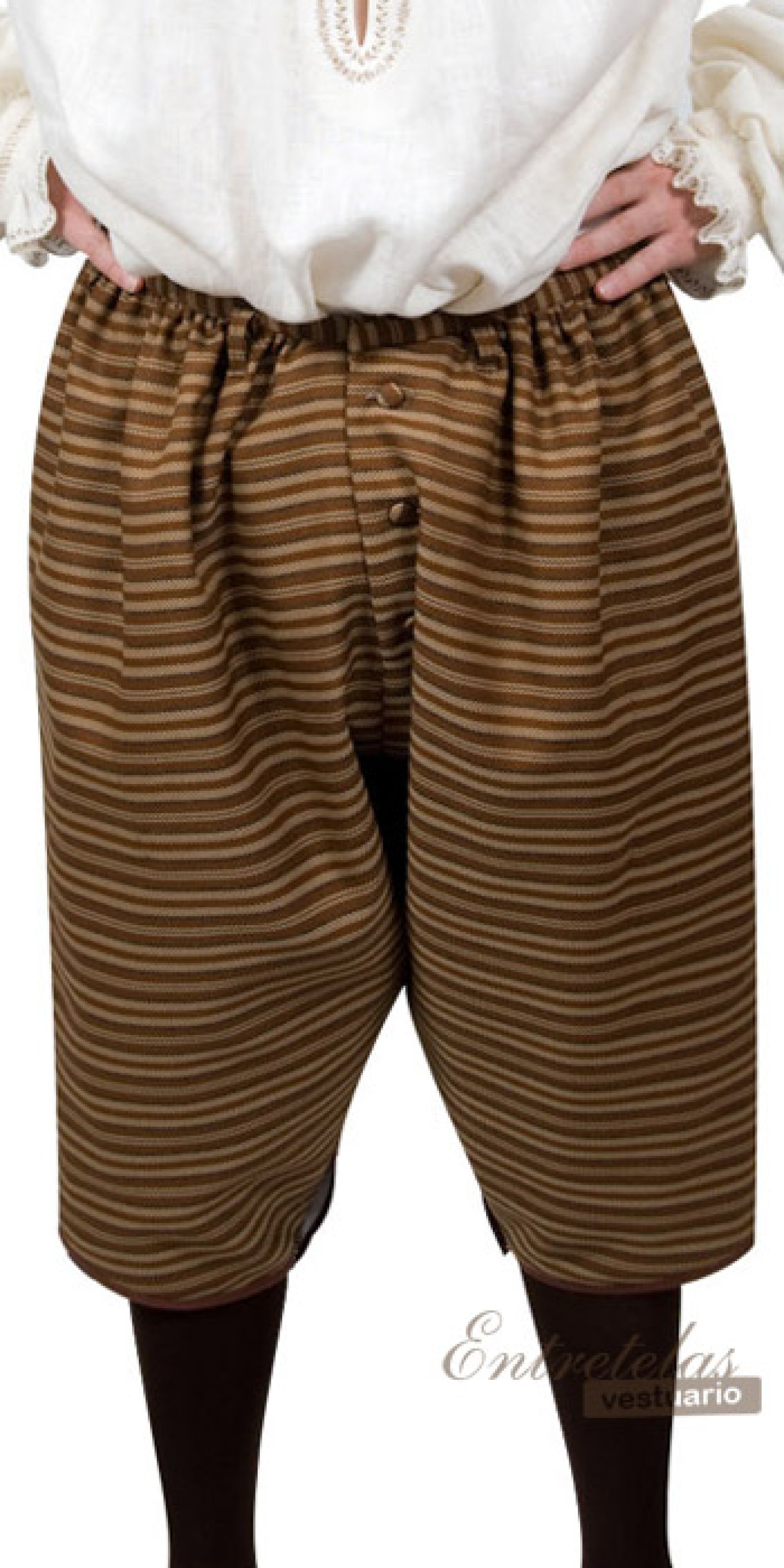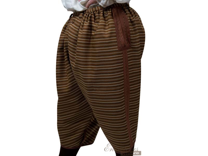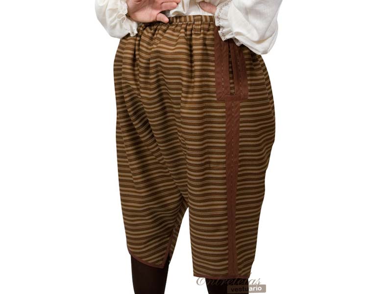 Calzas "a la veneciana ". Amplios calzones que cubren las piernas por debajo de la rodilla. Cierre de botones en el delantero. Amplios y prácticos bolsillos