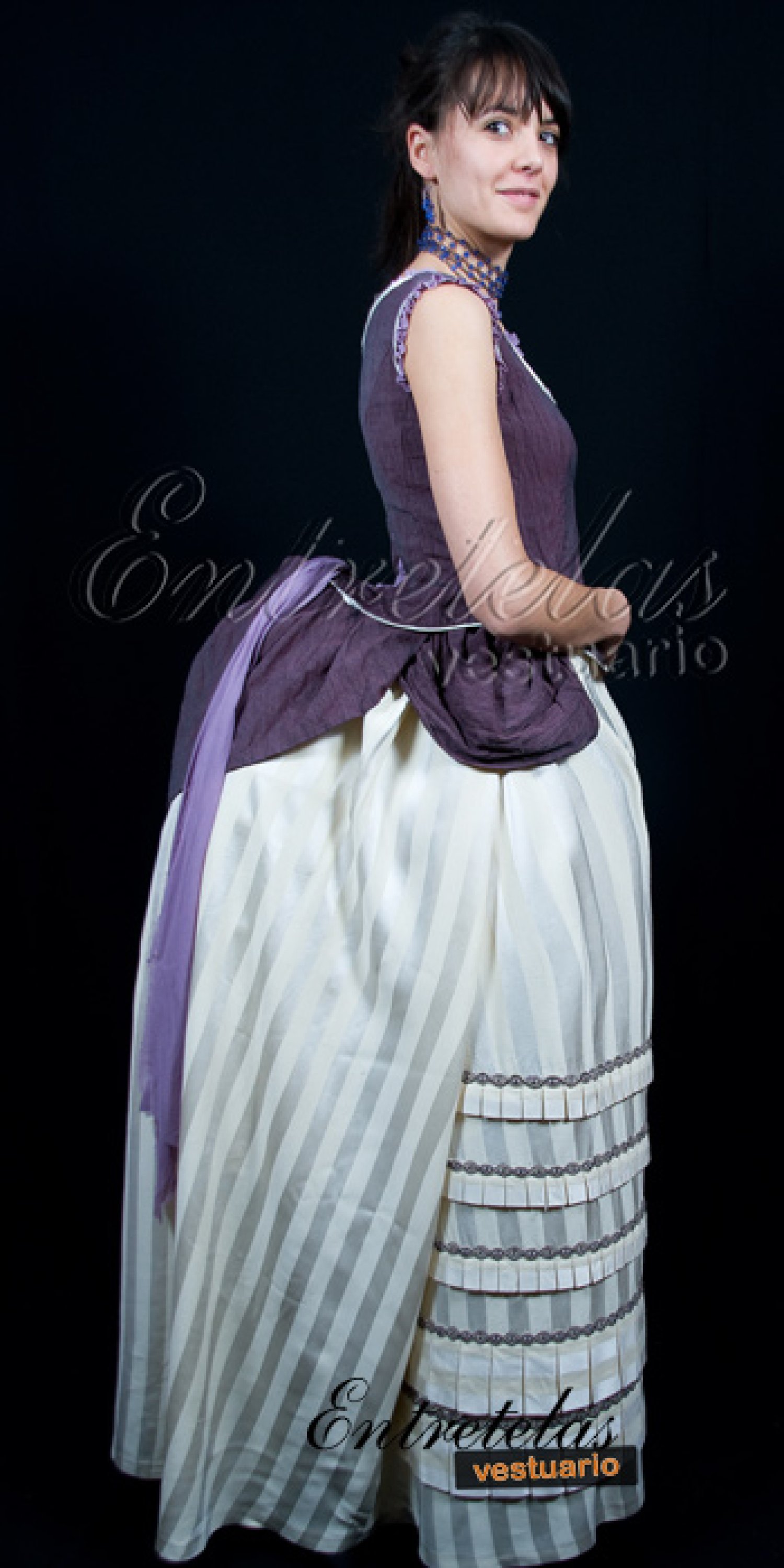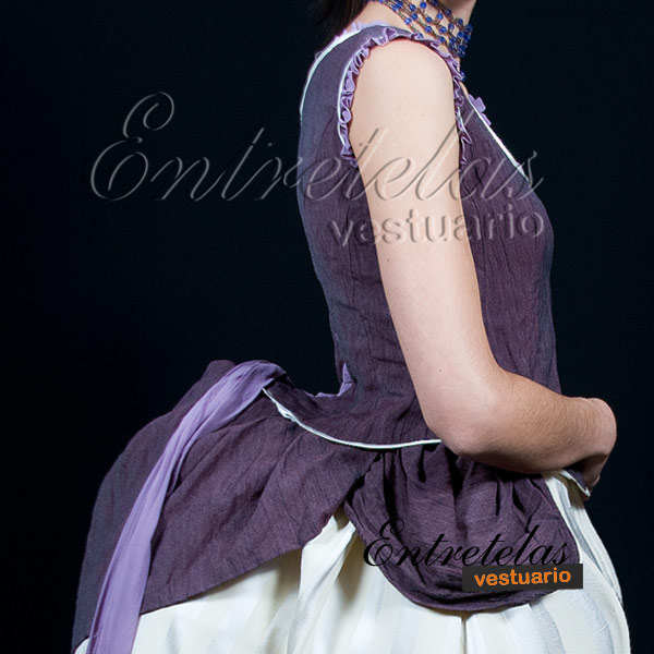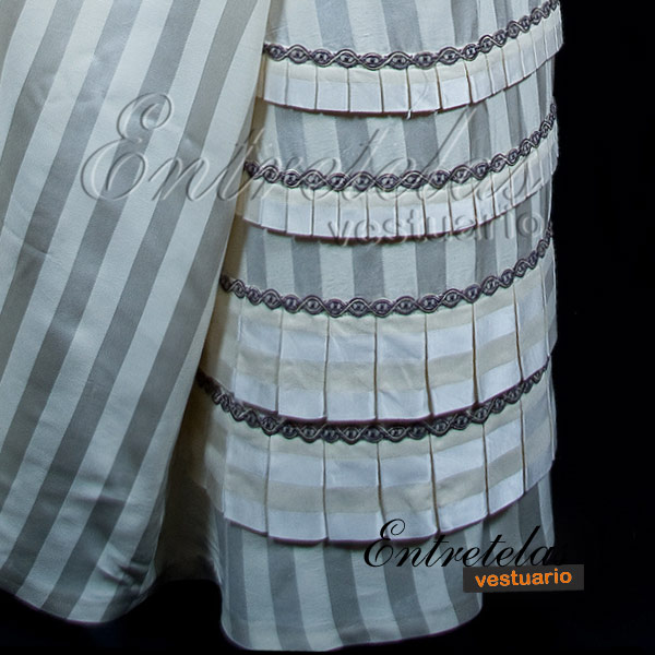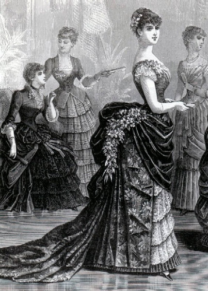 En estos años, el vestido se abulta y se coloca encima de un polisón, especie de jaula emballenada, que cada vez se acentúa más. El polisón vive un nuevo periodo de éxito hasta que en 1892 desaparece. Reaparecen las polonesas, descubriendo completamente la falda por delante y formando detrás una cola más o menos larga, con volantes, bandas de encaje, pasamanería... según el momento o una túnica drapeada en los lados y el polisón detrás .Estructura interior no incluida.
